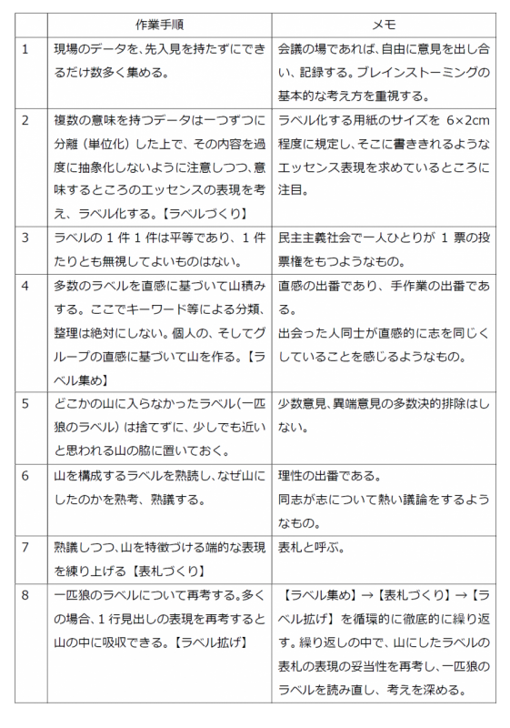 1.思想 2.一仕事(ひとしごと) 3.著作 4.思考を深化させた環境 5.ウェブ情報 まとめ 文献 文末脚注 川喜田二郎は文化人類学の現地調査で得られるデータの含意を科学的に究明しようとする中から、そこに確とした方法論がないことに気づき、自ら方法論の確立に取り組んだ。集められたデータから解決するべき課題を抽出する作業の姿勢に、彼の思想が最もはっきりと表れている。その部分を抽出すると、次のようになる。 表1 作業手順に見られる川喜田の考え方
