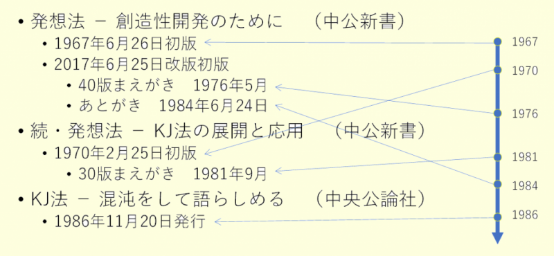 川喜田二郎にはKJ法に直接かかわる著作が3冊ある。それらの執筆時期を図示したものが図3である。 図3 KJ法の著作の執筆時期